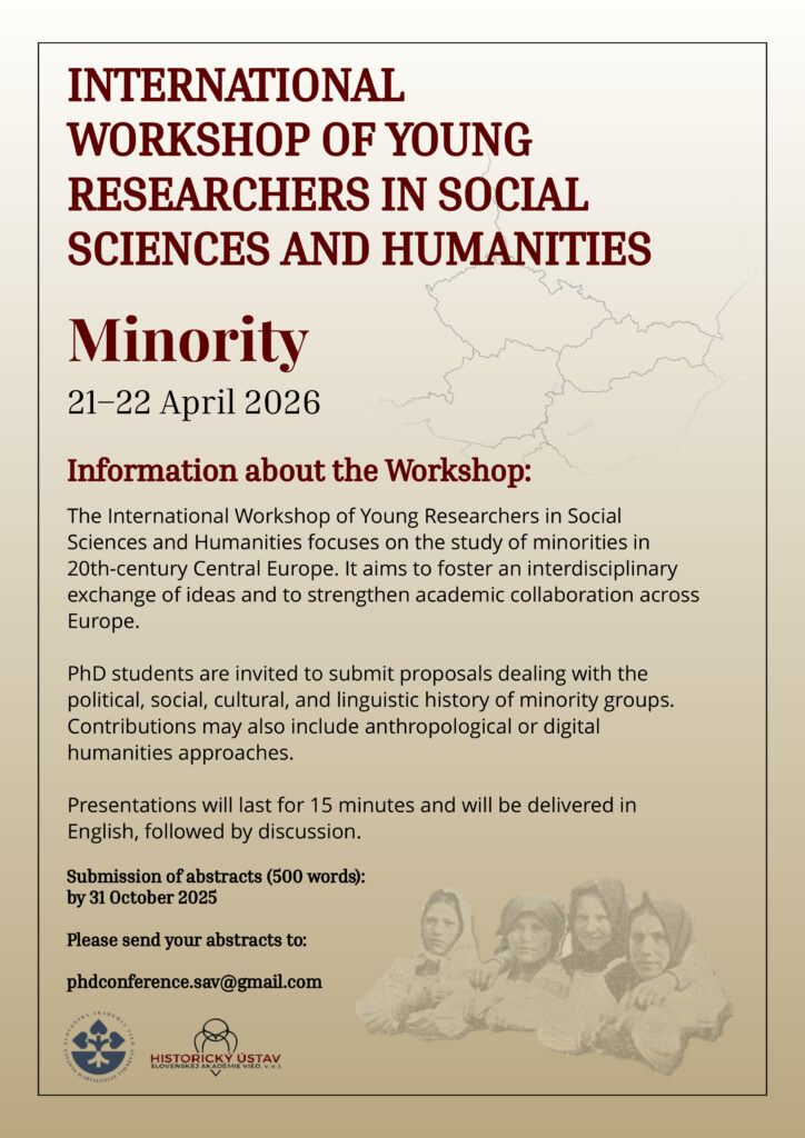 We are pleased to invite PhD students from various academic institutions who are interested in the history of Central Europe to the First International Workshop of Young Researchers in Social Sciences and Humanities, organized by the Historical Institute of the Slovak Academy of Sciences. The workshop will take place on April 21–22, 2026, in Bratislava, Slovakia, with the central theme: “Minority.”