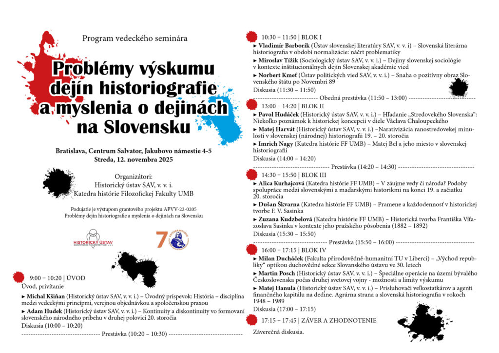 Historický ústav SAV, v. v. i. v spolupráci s Katedra histórie/Department of History FF UMB Banská Bystrica organizuje vedecký seminár s názvom Problémy výskumu dejín historiografie a myslenia o dejinách na Slovensku. Podujatie sa bude konať 12. novembra 2025 v Bratislave.