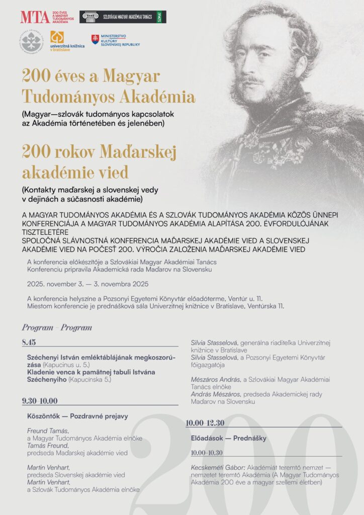 V pondelok 3. novembra 2025 uplynie 200 rokov od historického vystúpenia grófa Istvána Széchenyiho na zasadnutí dolnej komory Uhorského parlamentu, v rámci ktorého ponúkol ročné výnosy svojich statkov na účel založenia Maďarskej učenej spoločnosti. Jeho príklad nasledovali viacerí prítomní, čím sa začal proces legislatívneho zakotvenia a postupného budovania Maďarskej/Uhorskej akadémie vied. Széchenyiho reč a šľachetný čin je považovaný za zásadný krok k založenia akadémie. Miestom rokovania dolnej komory bol Župný dom vo vtedajšom Prešporku, čiže akt založenia sa viaže k Bratislave, k historickej budove Národnej rady Slovenskej republiky na Župnom námestí. Maďarská akadémia vied (MTA) si okrúhle výročie svojho založenia pripomenie v Bratislave spoločnou konferenciou s SAV.